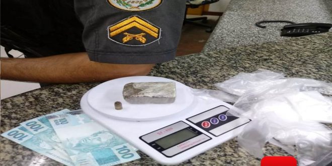 Em buscas na casa, os policiais encontraram dentro do guarda-roupas a máquina de cartão de crédito utilizada no comércio ilícito. No quintal da residência, foi apreendido um pedaço grande de maconha, 64 porções menores já embaladas para venda, uma balança de precisão, uma embalagem com um comprimido de ecstasy, além de R$ 274 em dinheiro, tesoura e rolos de plástico filme.