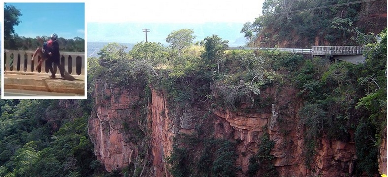 O homem chega a colocar uma das pernas para fora da mureta do Portão do Inferno, quando o motociclista chega correndo e o puxa do local.