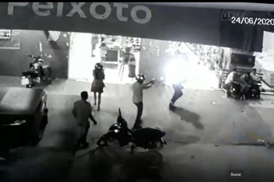 Eles chegaram atirando em direção ao empresário, que tenta fugir, mas cai no chão.