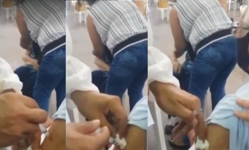 O vídeo foi feito para registrar o momento que o senhor Benedito vacinou, mas a família acabou flagrando que o líquido continuou na seringa mesmo depois de aplicada no idoso.