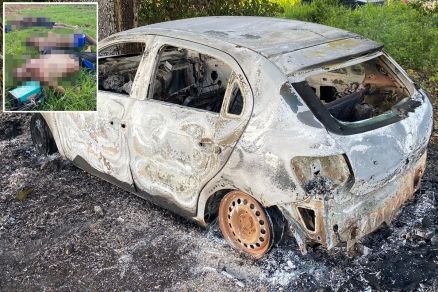 Próximo aos corpos, os PMs ainda localizaram um veículo Gol branco carbonizado. O veículo estava sem placa de identificação.