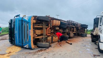 Uma carreta carregada tombou e interditou parte da BR-163, em Nova Mutum (264 km ao norte de Cuiabá), na manhã de terça-feira (20). Apesar dos danos, o condutor do veículo de carga não se feriu.